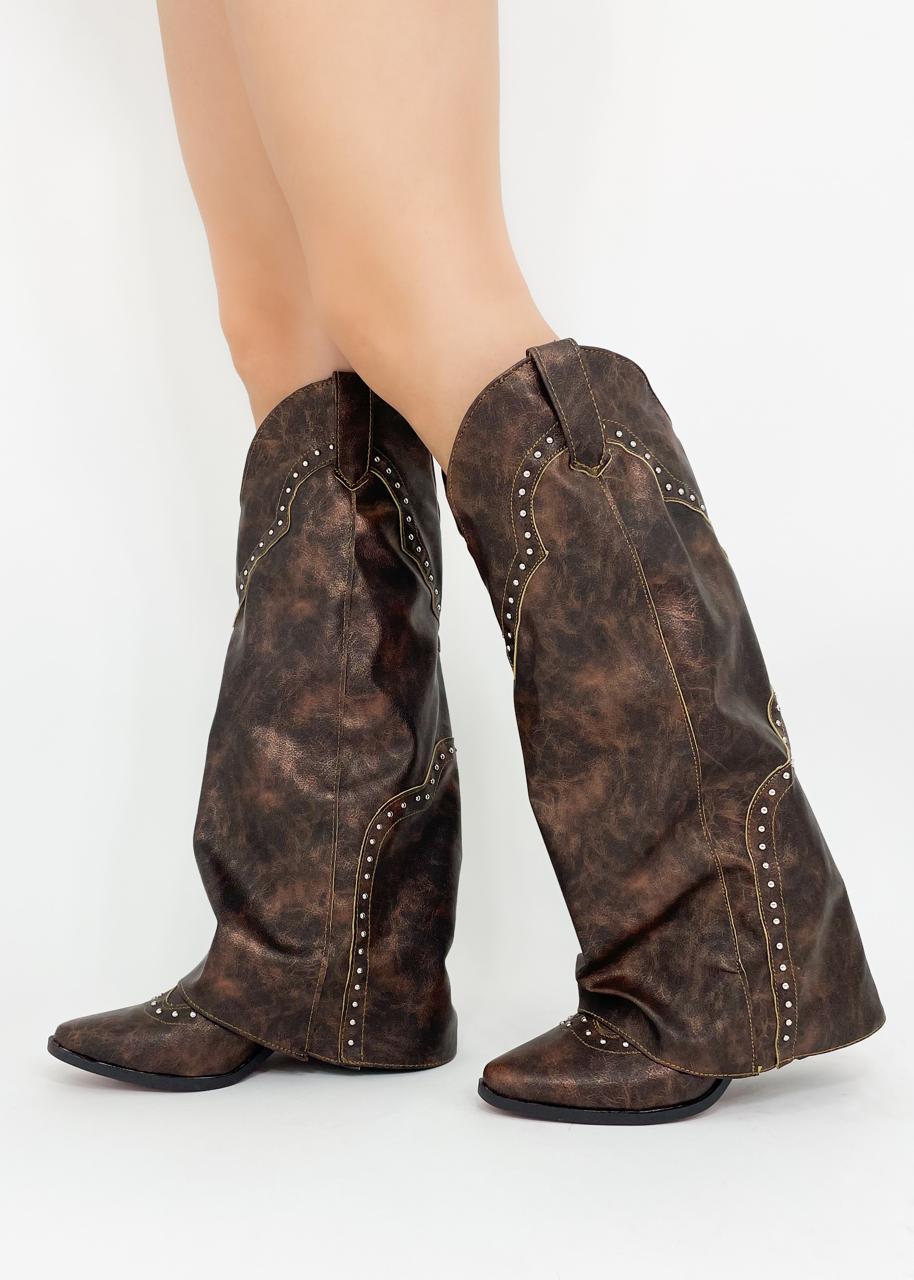 Elaboradas con sintetico de alta calidad, estas botas cuentan con estoperoles plateados que resaltan su estética rebelde y sofisticada. Su tacón cómodo y su silueta estilizada las hacen perfectas para cualquier ocasión, desde un look casual hasta uno más arriesgado.