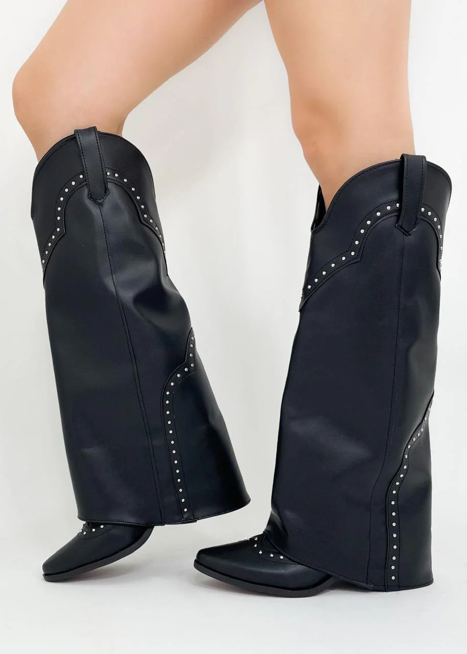 Elaboradas con sintetico de alta calidad, estas botas cuentan con estoperoles plateados que resaltan su estética rebelde y sofisticada. Su tacón cómodo y su silueta estilizada las hacen perfectas para cualquier ocasión, desde un look casual hasta uno más arriesgado.